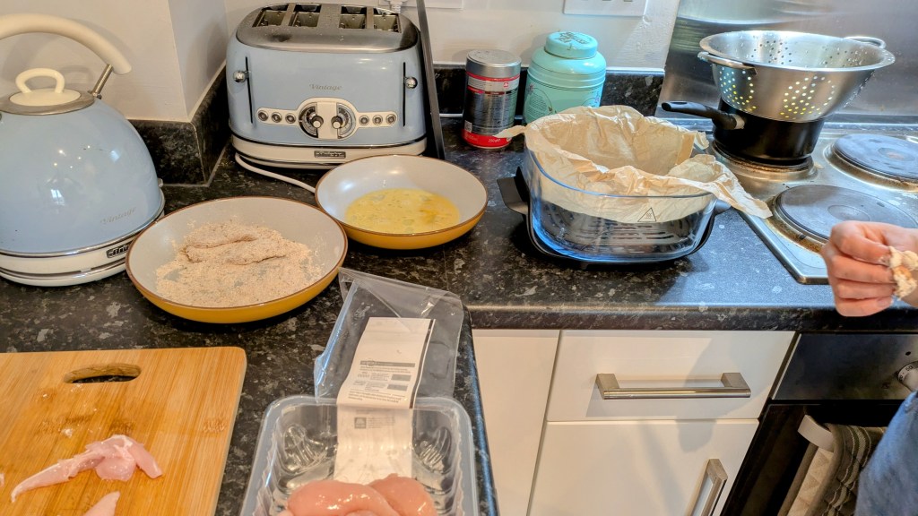 For our goujons, we used Aldi’s 400g packet of mini chicken fillets, de-veined, coated in egg, then tossed in flour (containing salt, pepper, chilli cayenne, onion salt, garlic powder, hot paprika, thyme, parsley, oregano).
