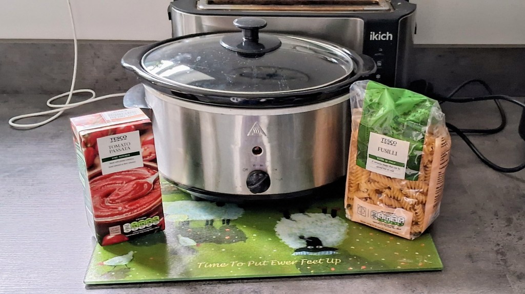 We thought, “we’ll have a bit of that, thanks!” and tried it. Yum. After the first attempt, we decided to make it even lazier by using our Tesco own-brand slow cooker. We learned very quickly that ribs were not suitable for slow cooking (they splintered). Enter: Ragù alla Napoletana sans ribs, aka ‘Meaty Pasta’.