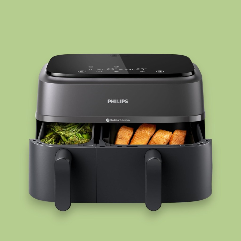 A dual drawer air fryer, split into a three litre basket and a larger six litre basket, with 13 cooking functions.